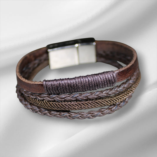 Hakiki Deri Erkek Bileklik | Kahverengi Örgü & İp Sargılı | Mıknatıs Kapama