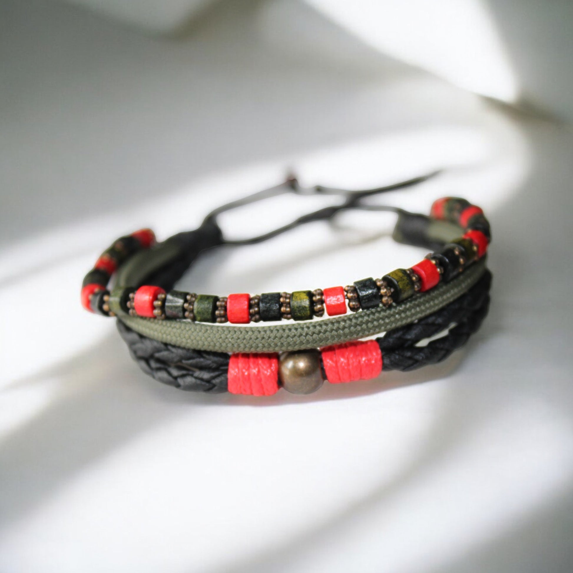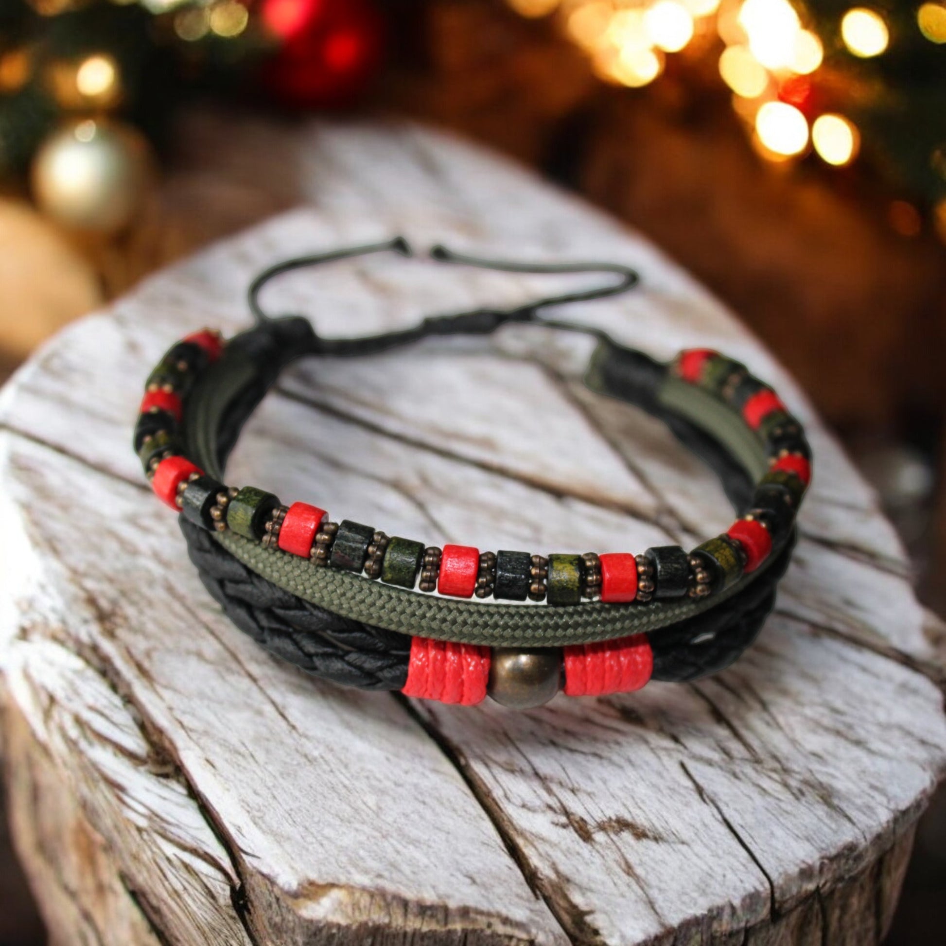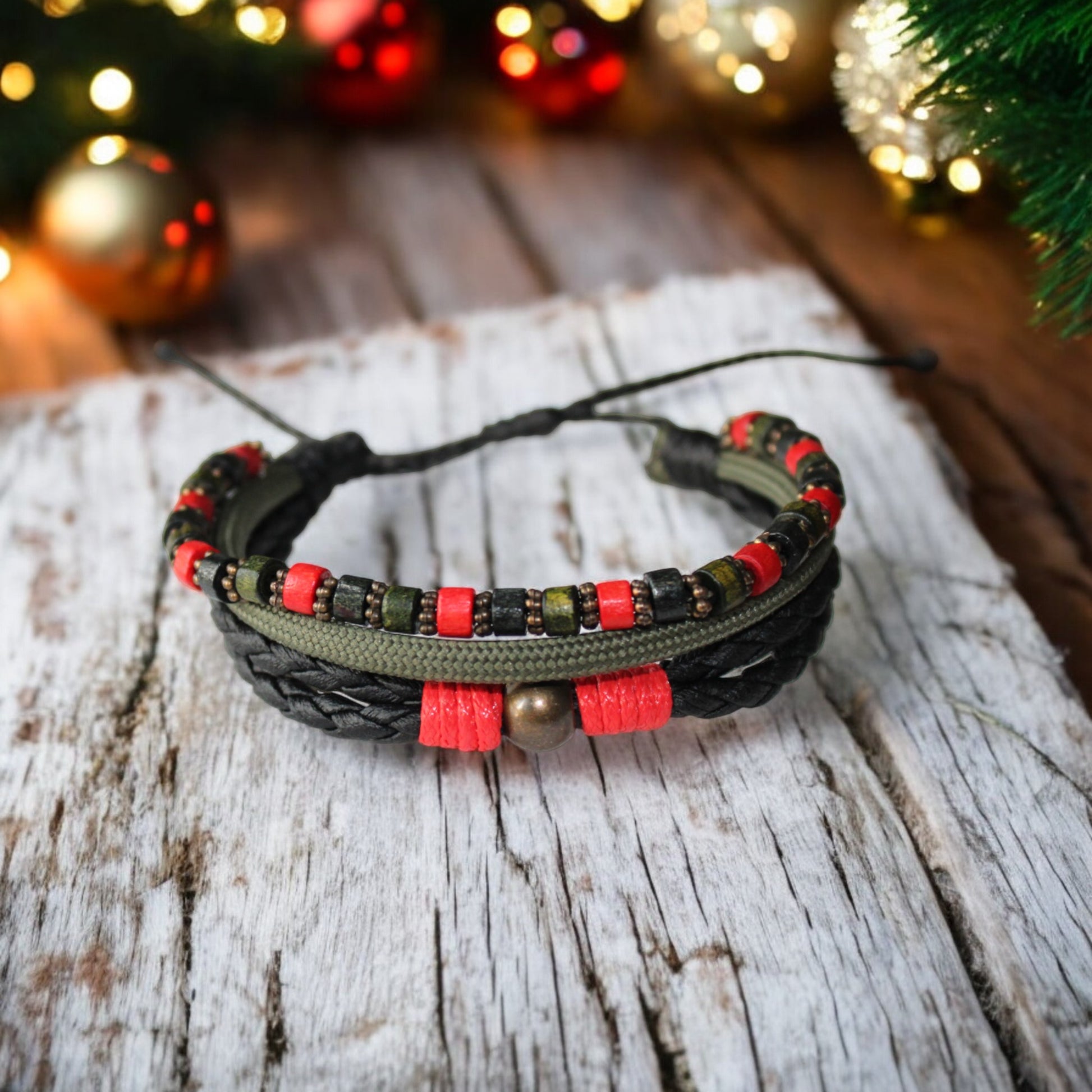 "Adventurer" serisinin bu özel parçası, kışın sıcaklığını ve yeni bir başlangıcın heyecanını bileğinize taşıyor. Bu bilekliği tasarlarken, yılbaşı gecesinin o büyülü enerjisinden ilham aldık. Kırmızı, umudu ve tutkuyu; haki ve siyah tonları ise sağlamlığı ve macerayı temsil ediyor.