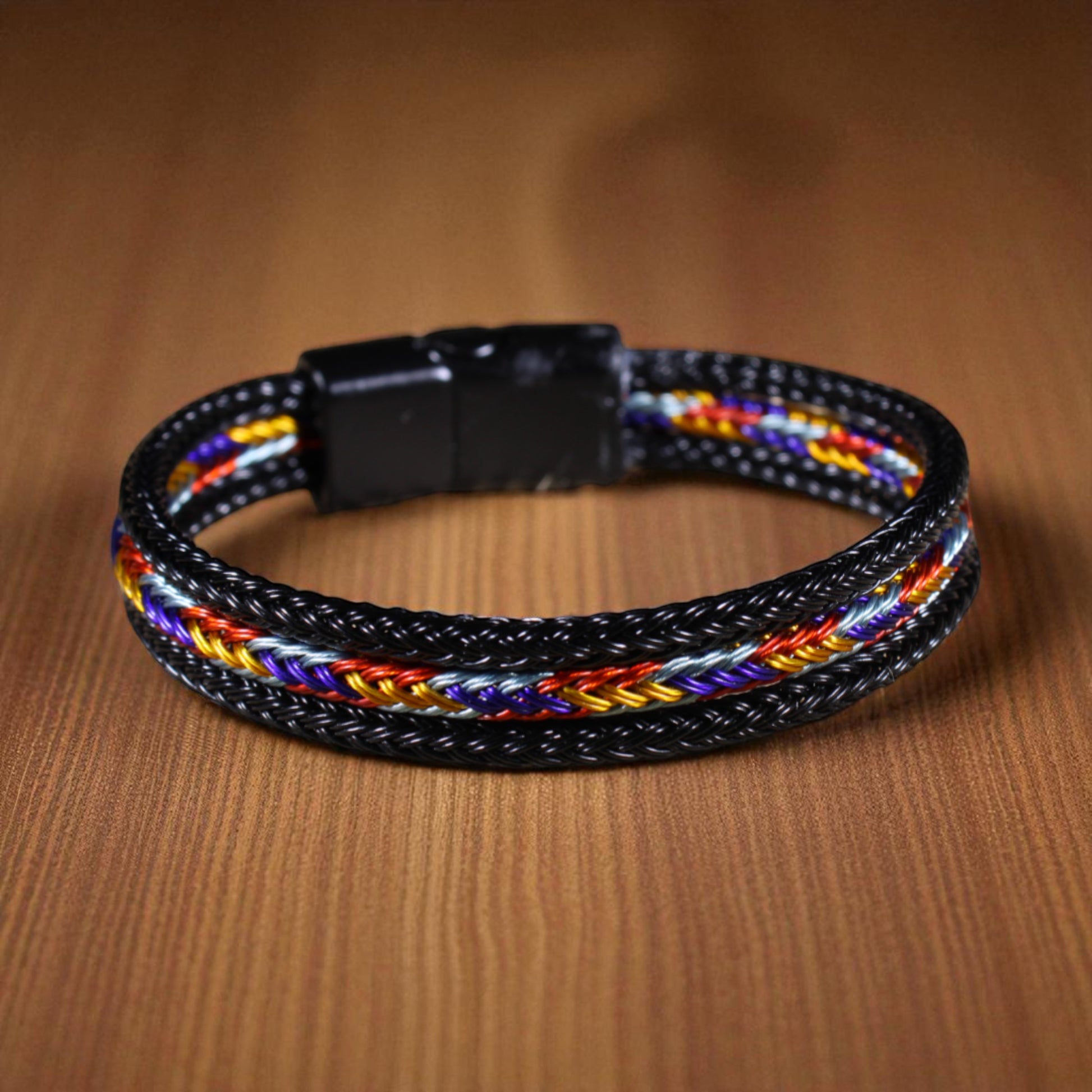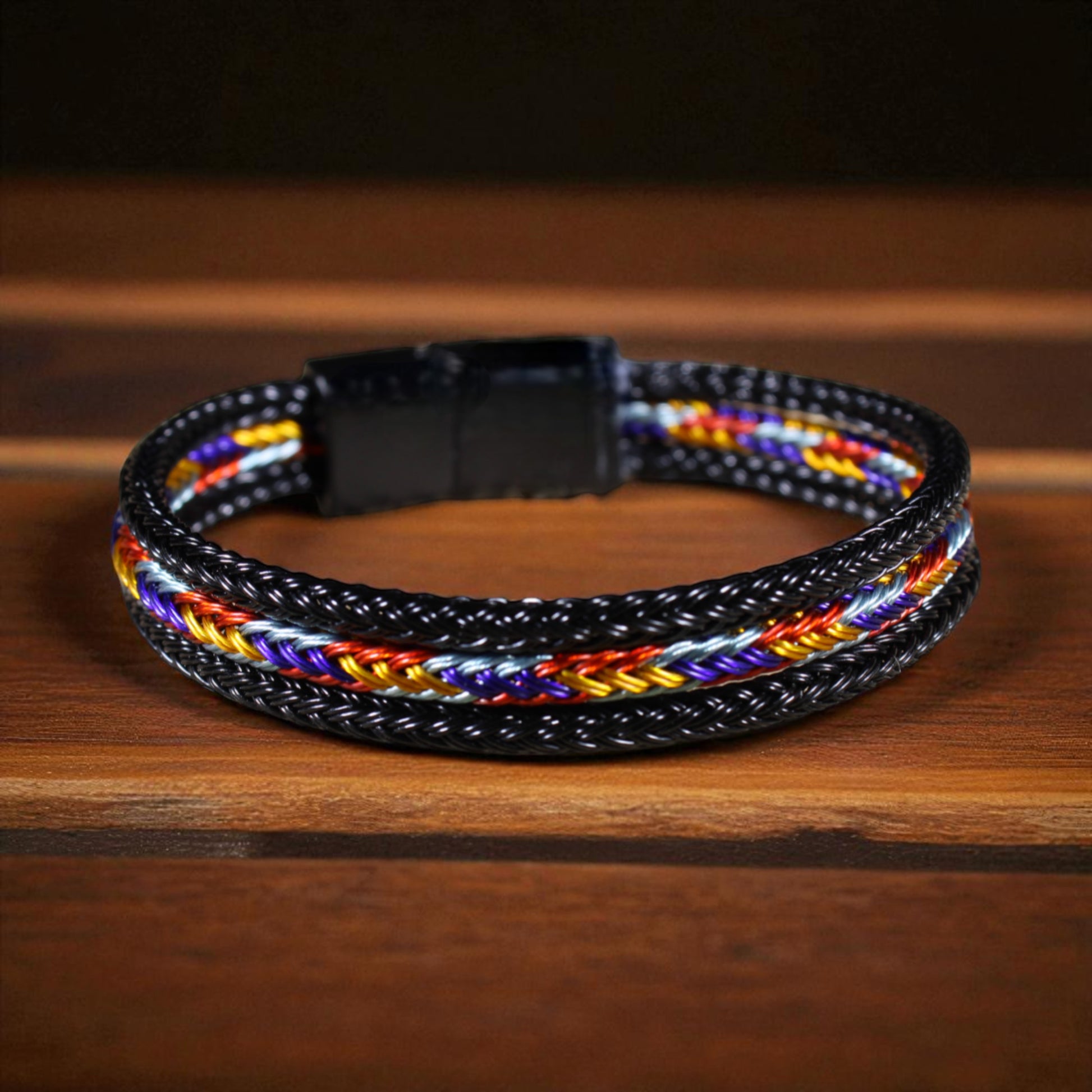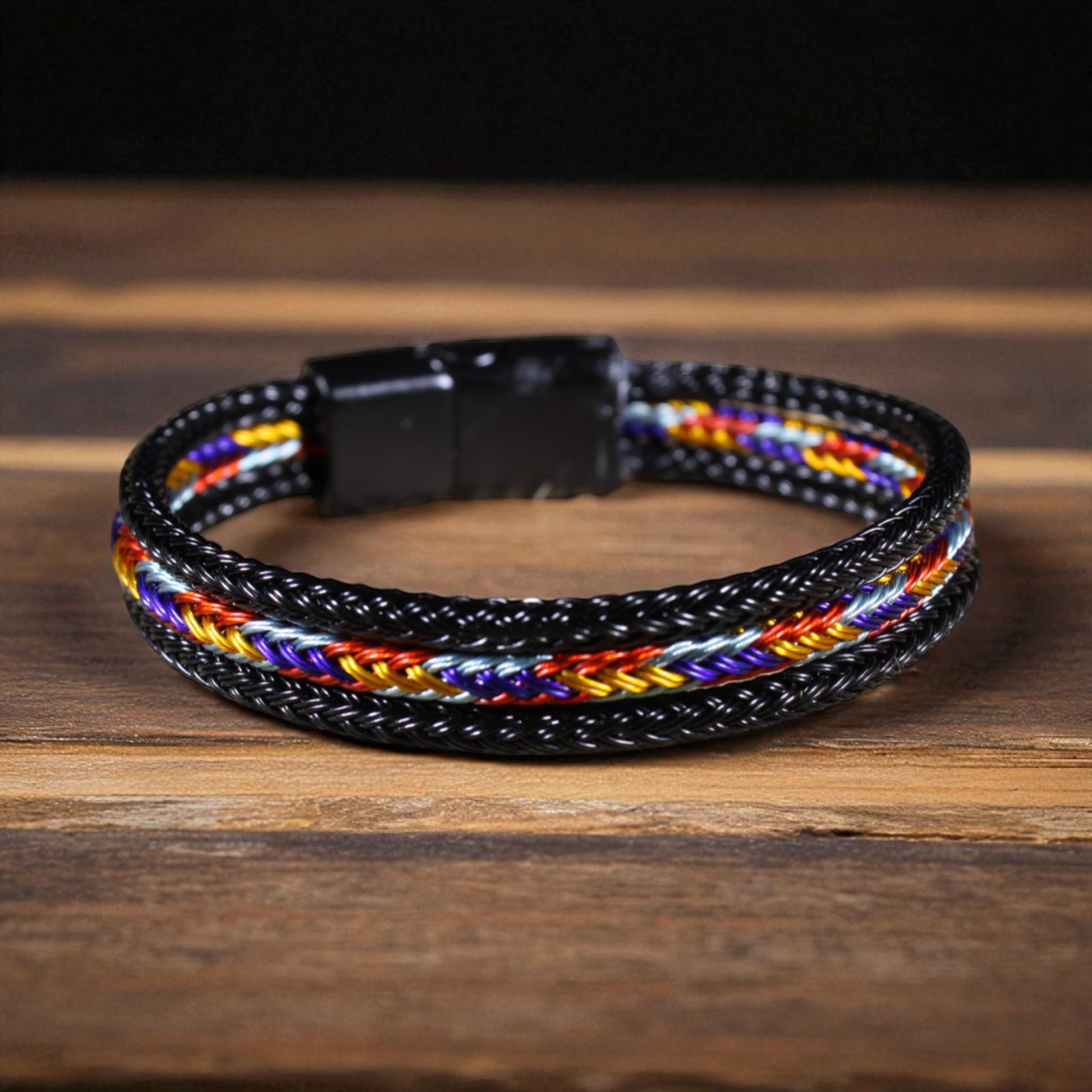 Bu özel tasarım bileklik, siyah çeliğin güçlü duruşunu çok renkli hasır örgü detayıyla buluşturuyor.