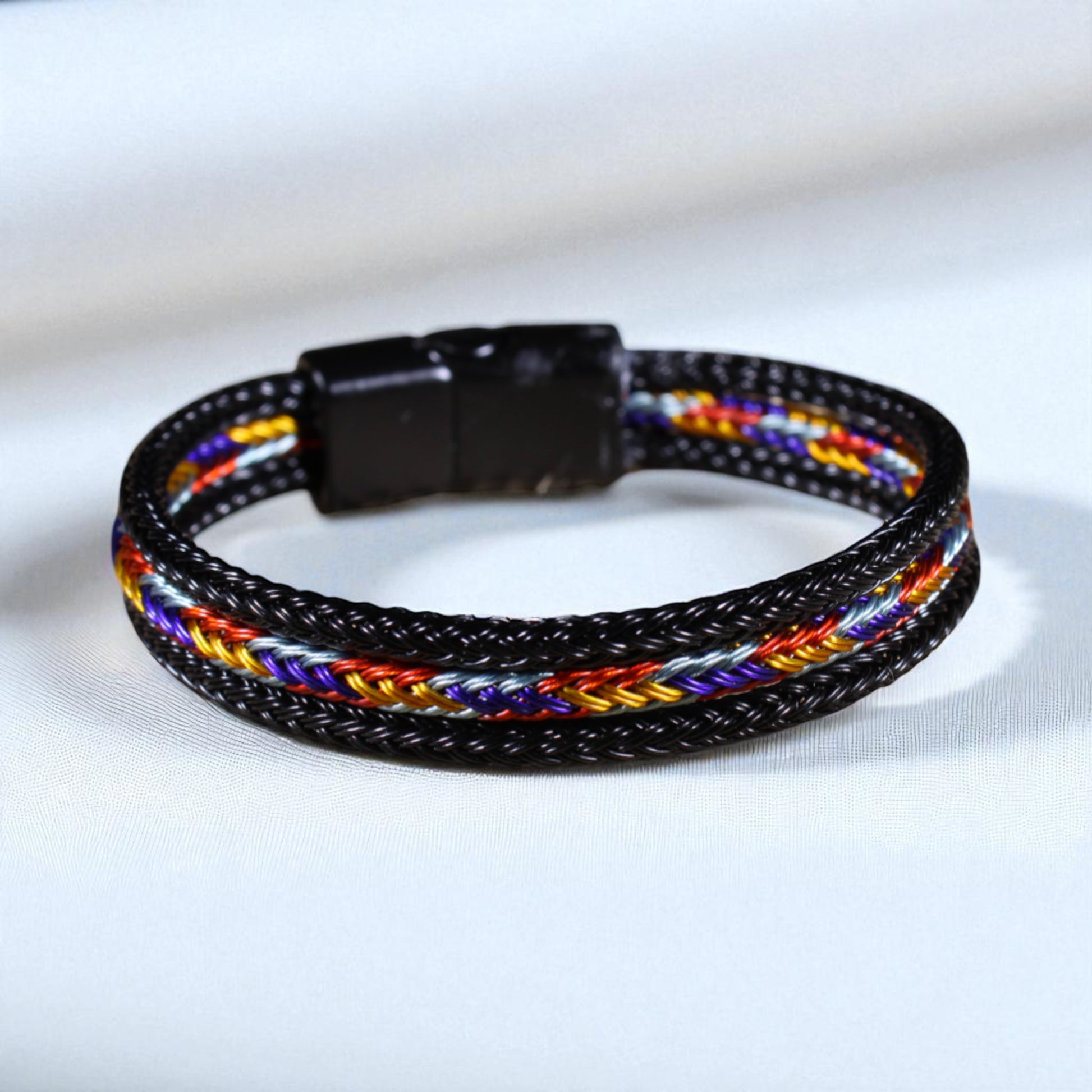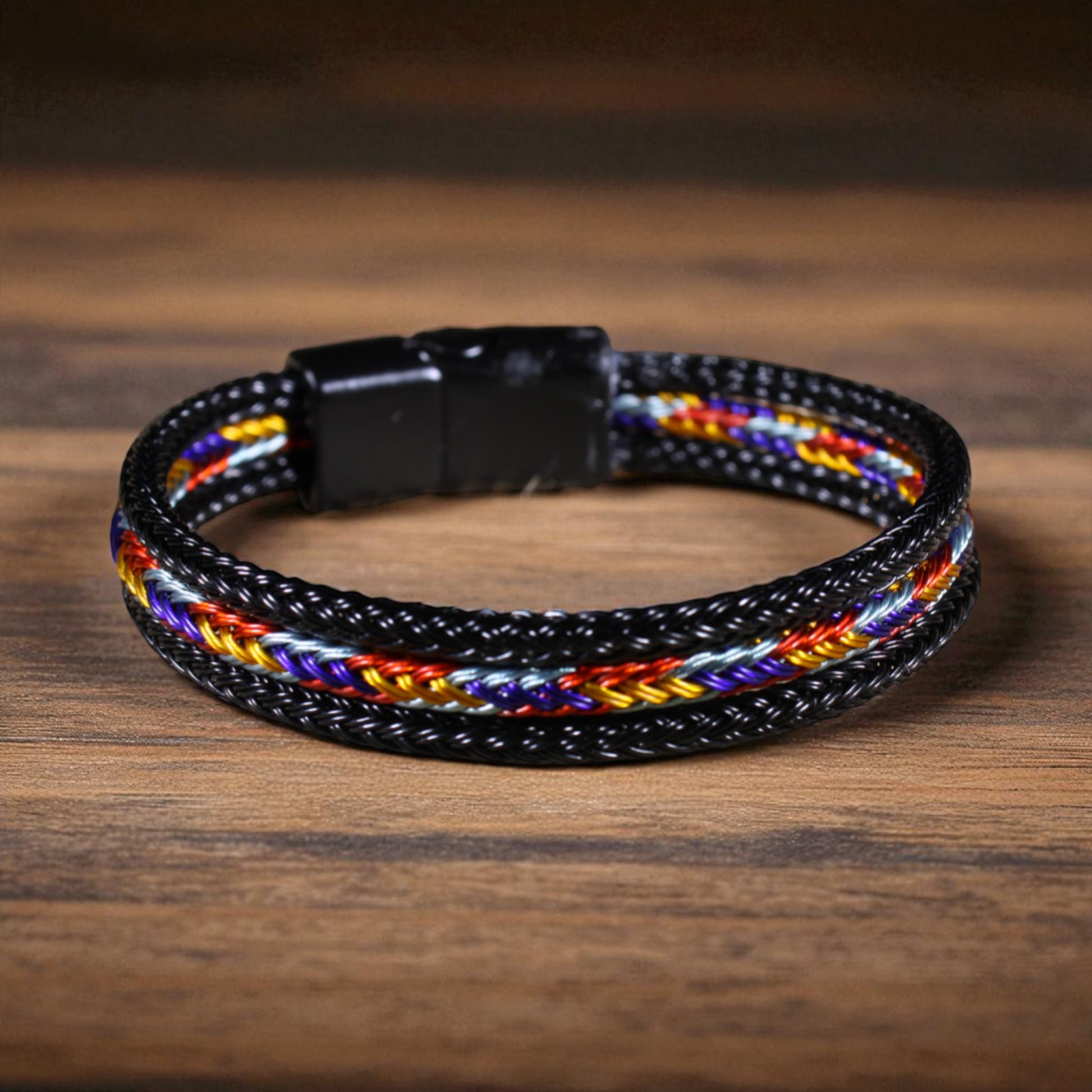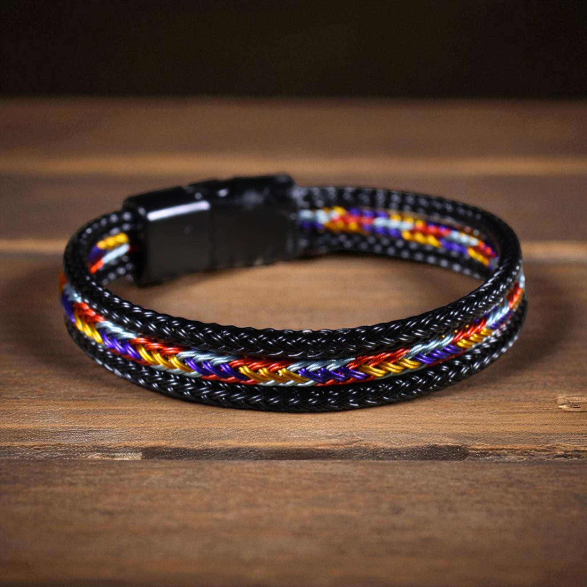 Bu özel tasarım bileklik, siyah çeliğin güçlü duruşunu çok renkli hasır örgü detayıyla buluşturuyor.