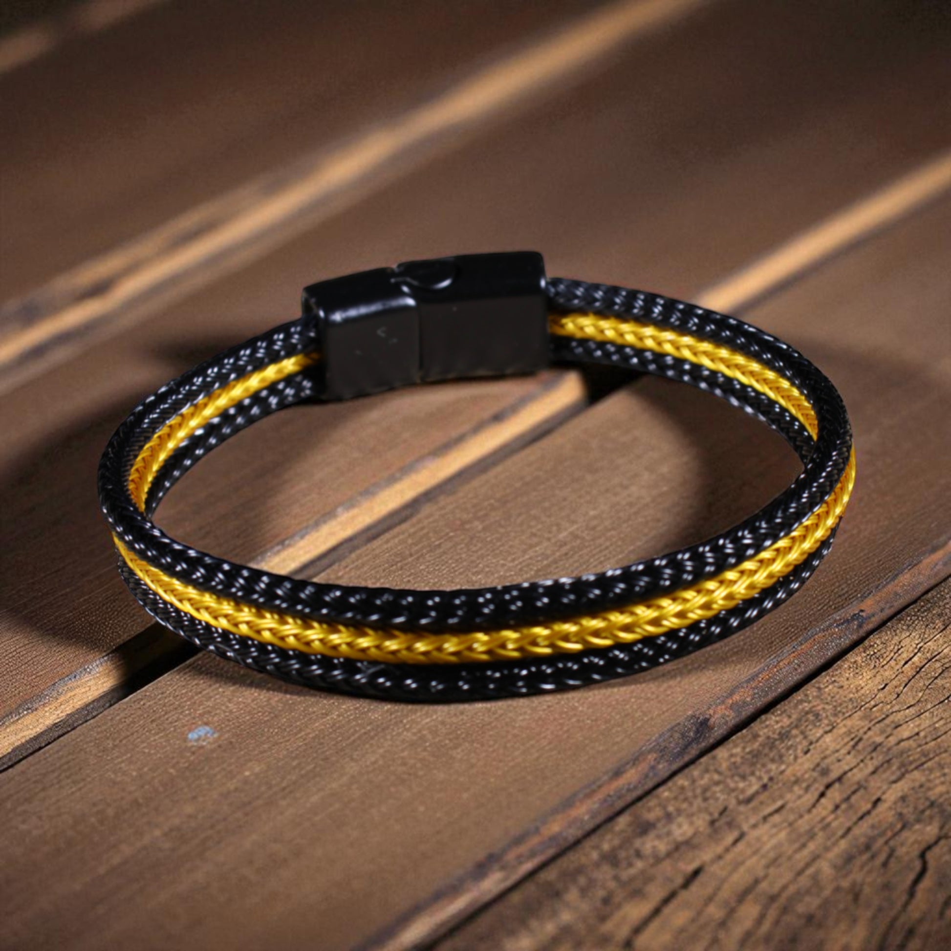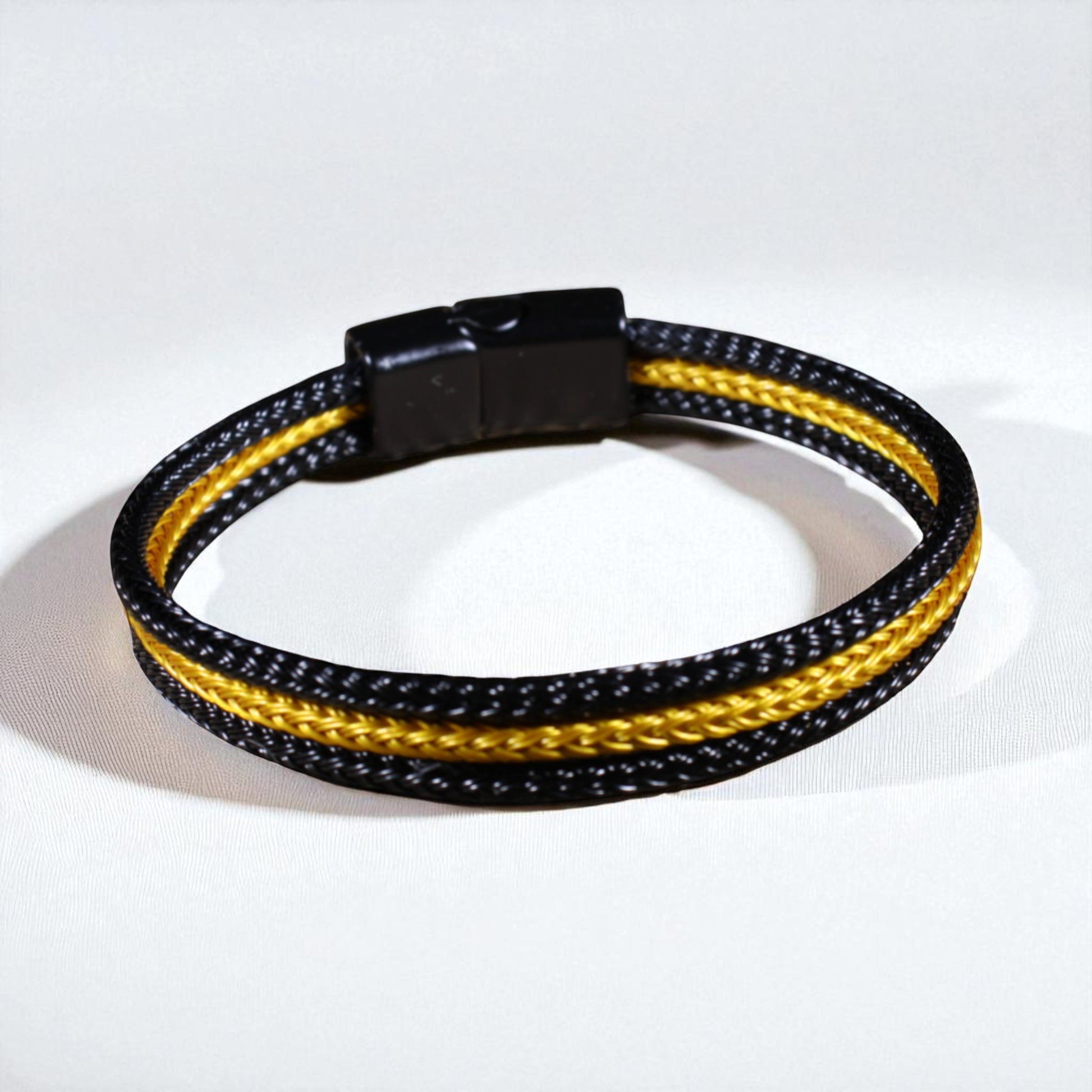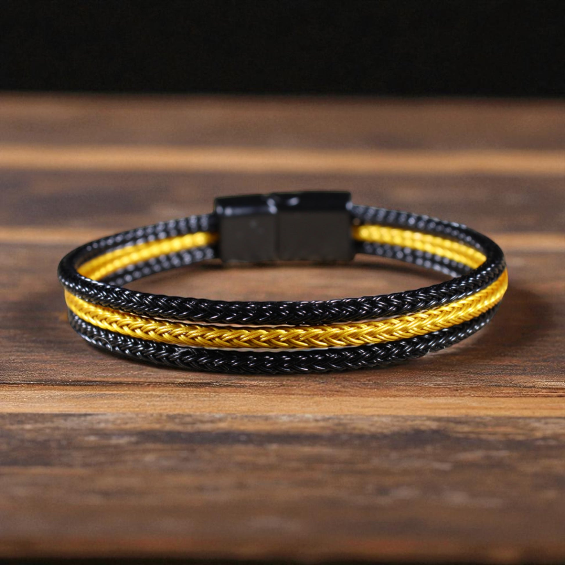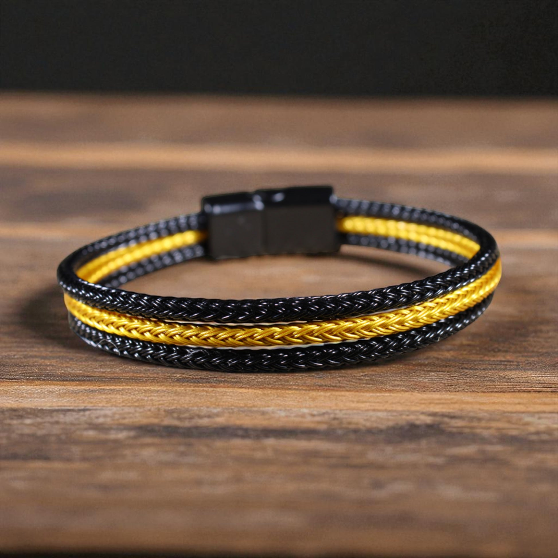 Siyah & Sarı Çelik Hasır Bileklik – Mıknatıslı Kapama, 4 Beden, Üçlü Örgü Tasarım