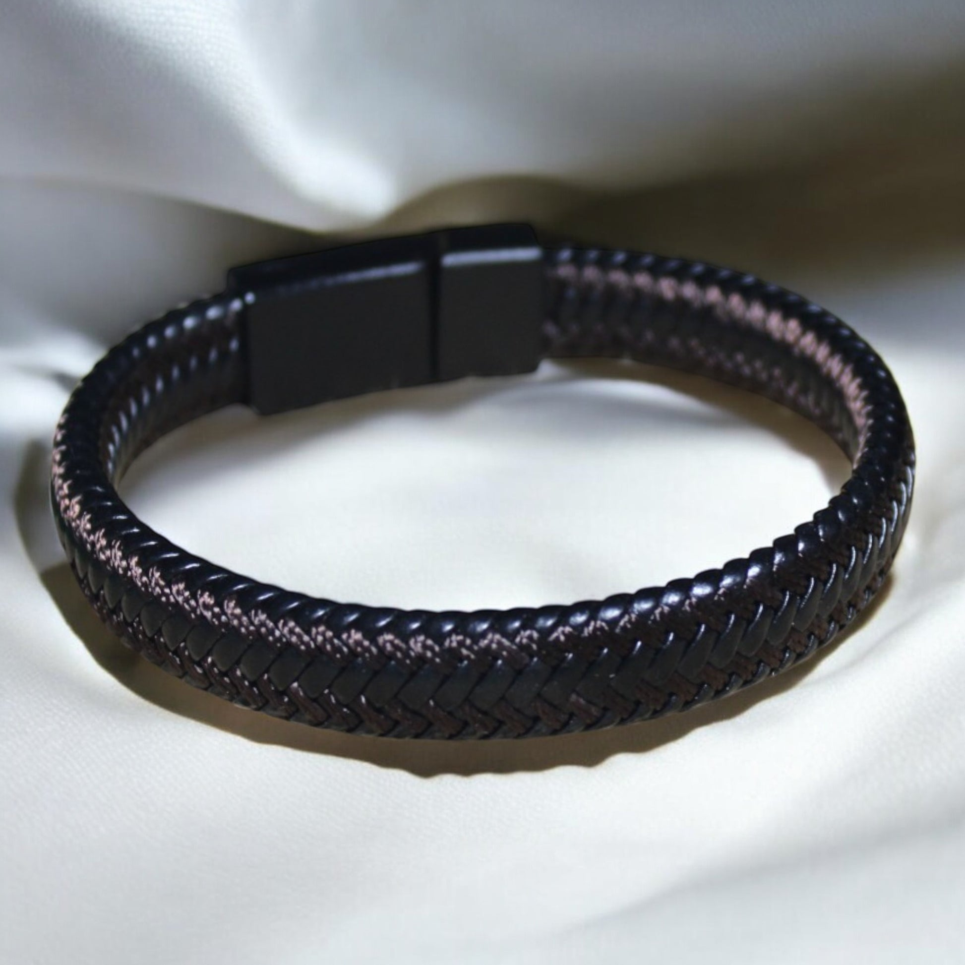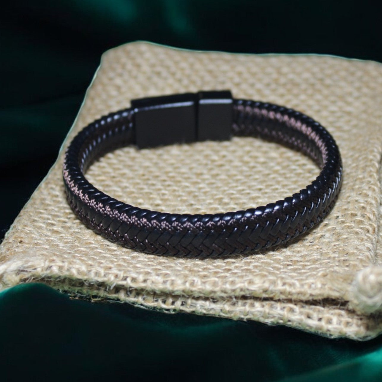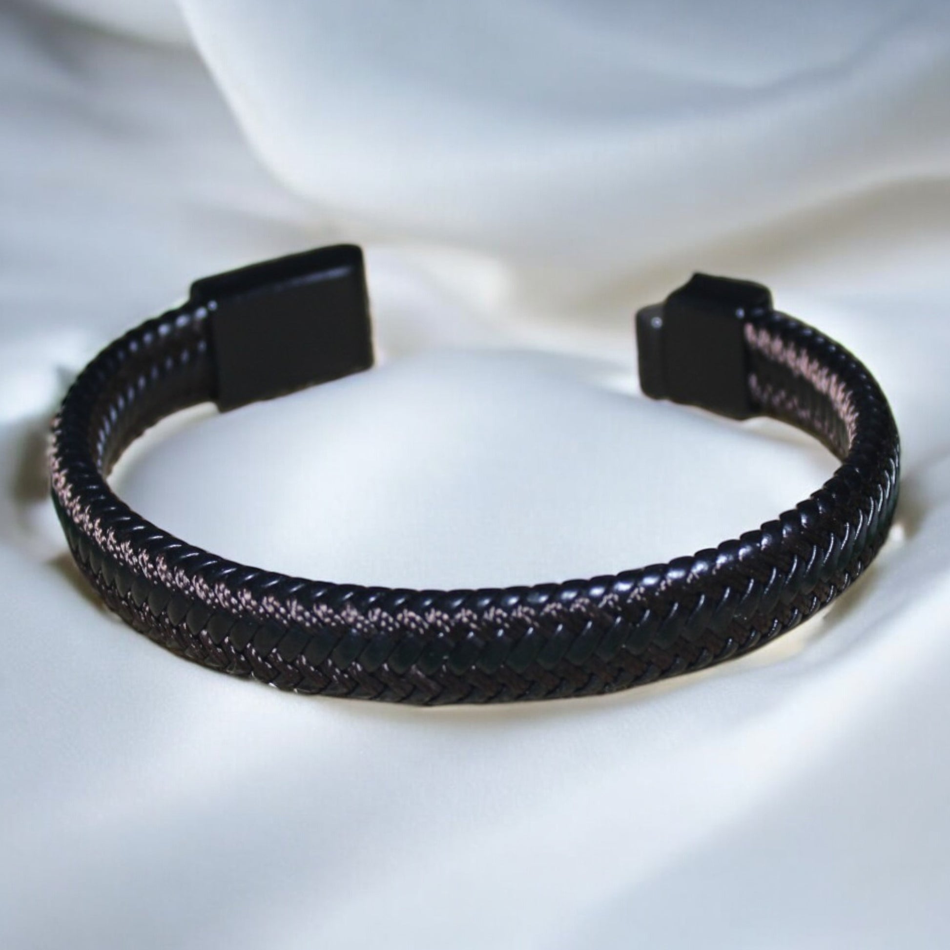 Erkek Deri Bileklik - El Yapımı Hakiki Deri - Siyah Deri Içinde Kahverengi Örgü