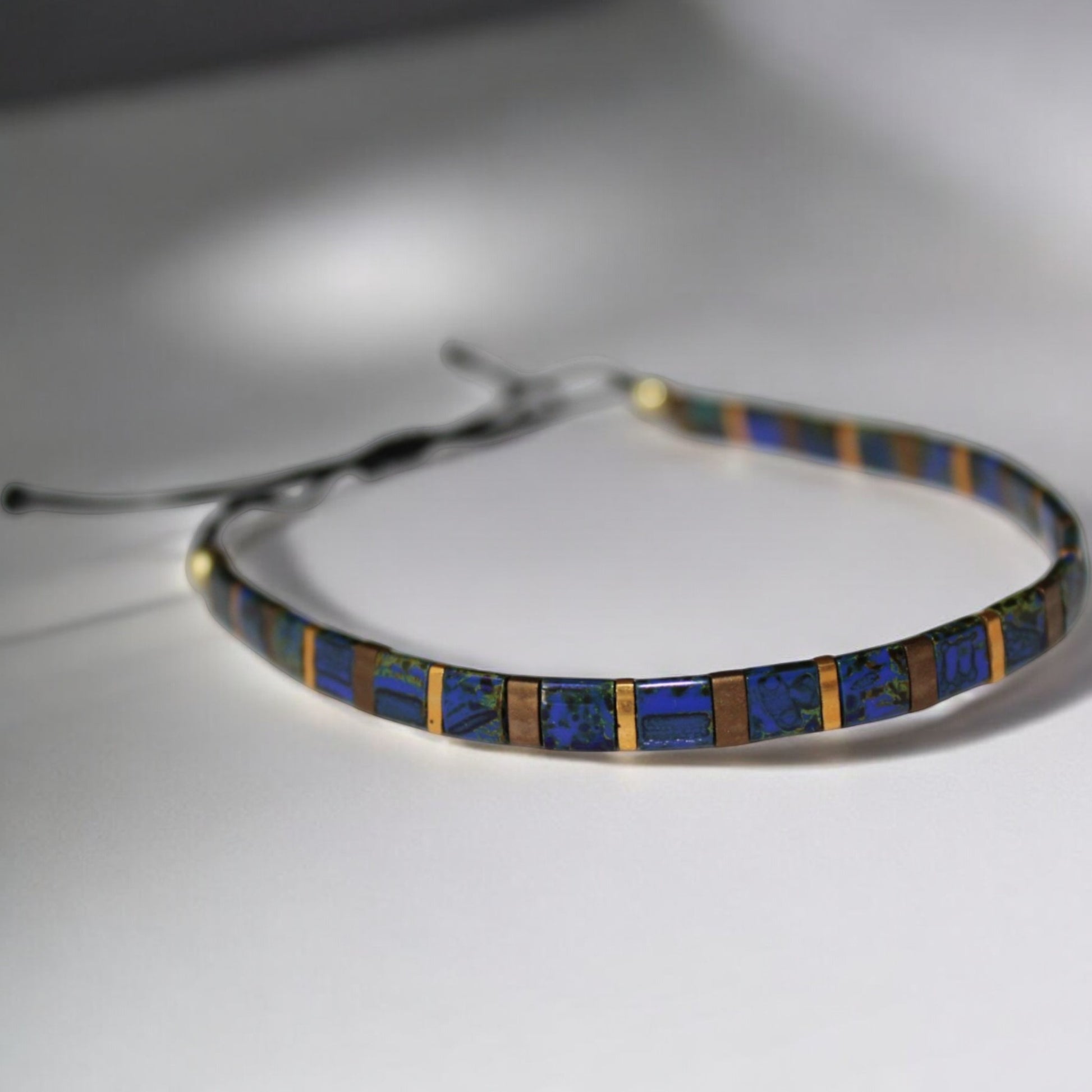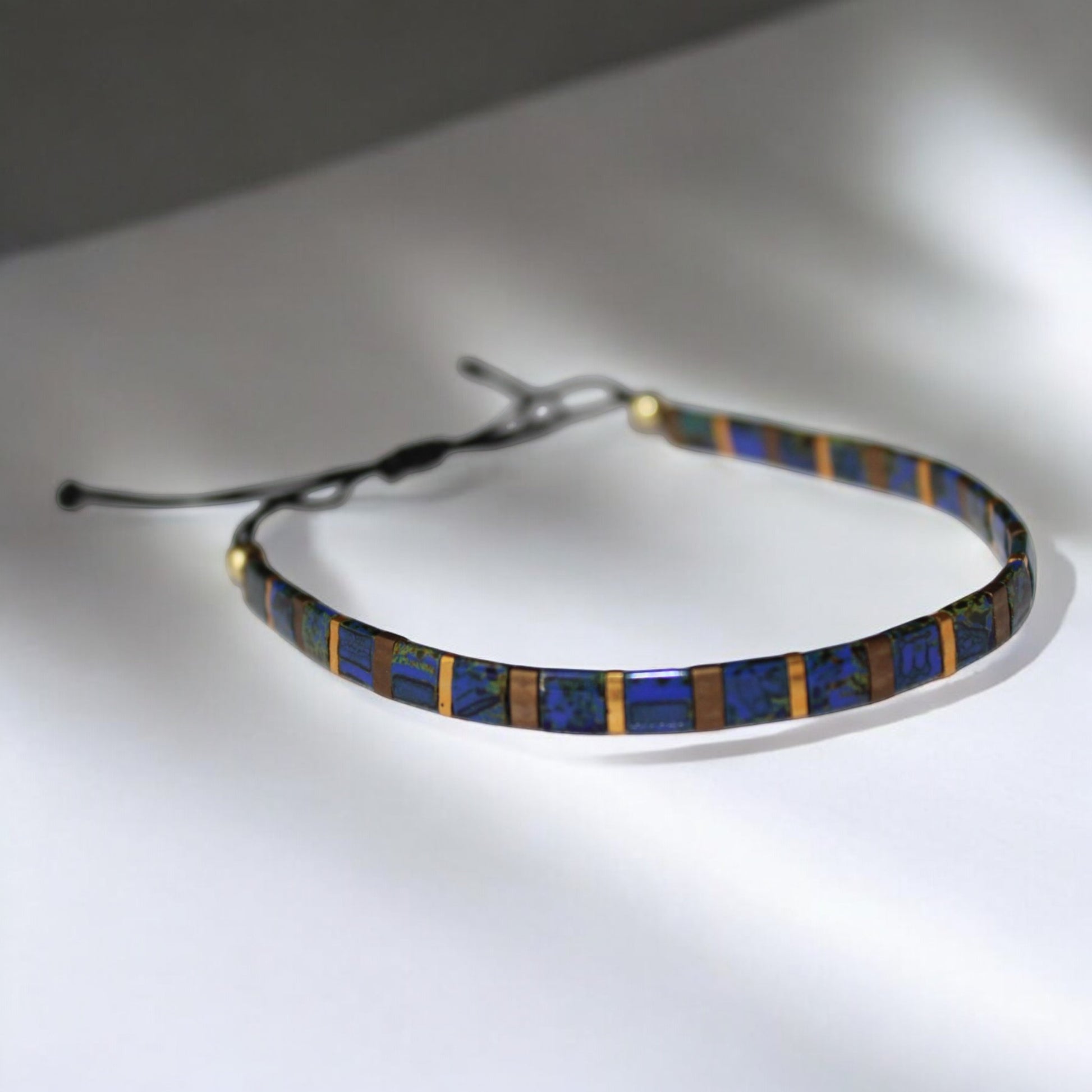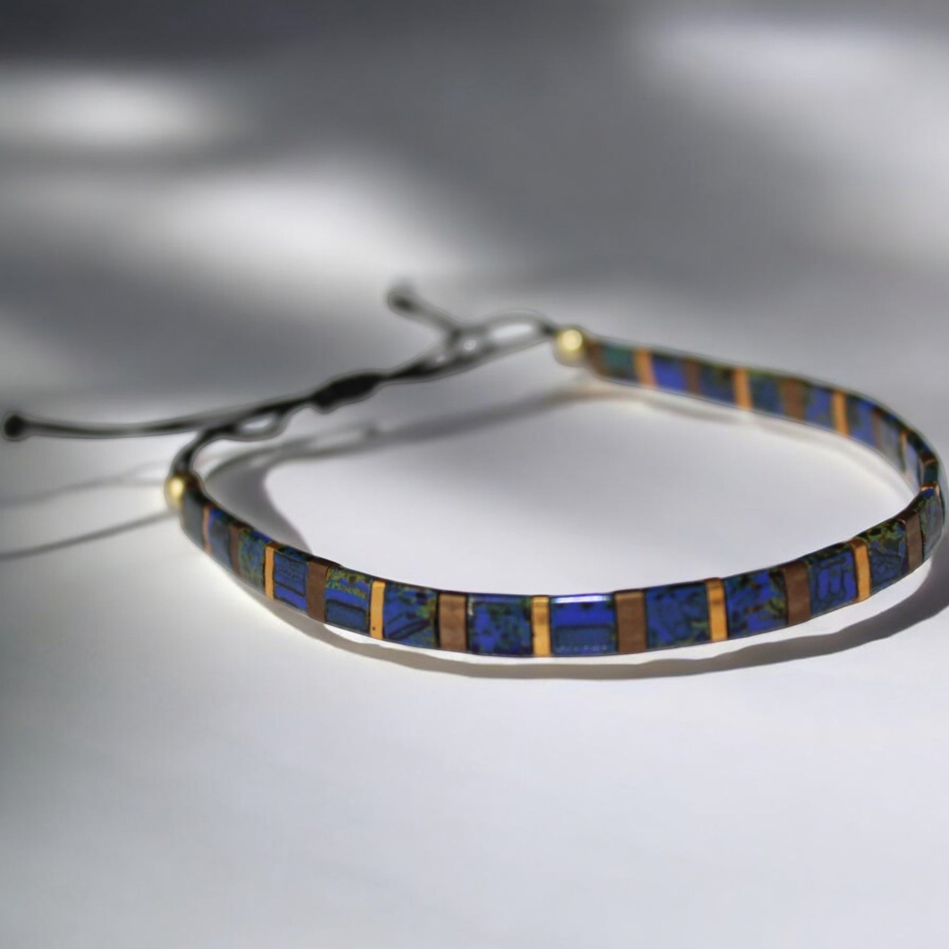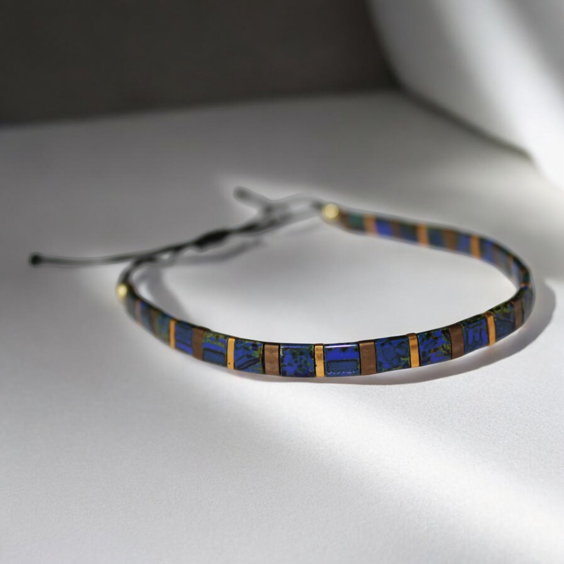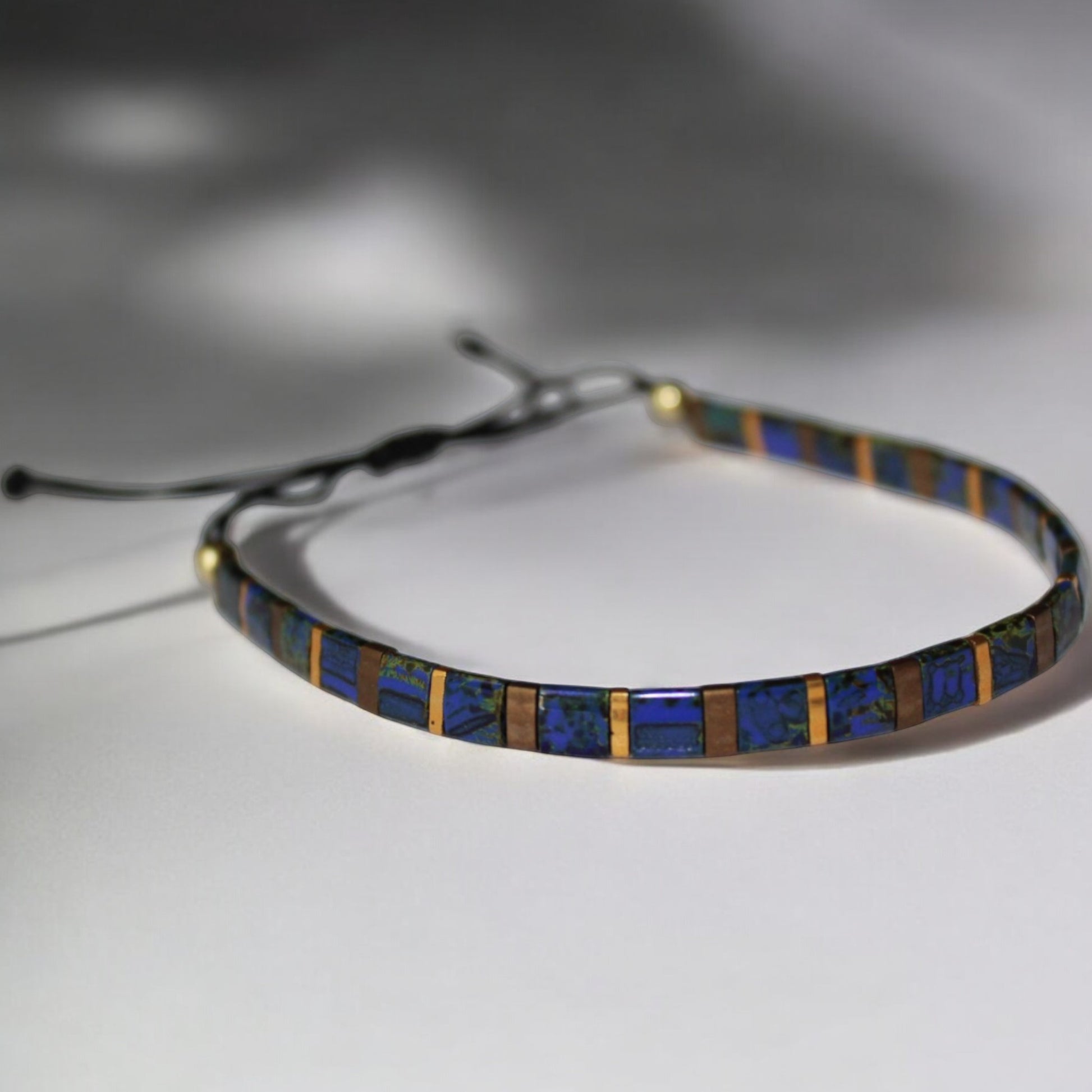 El Yapımı Tila Boncuk Bileklik – Lacivert Altın Antik Sarı – Ayarlanabilir Unisex Tasarım