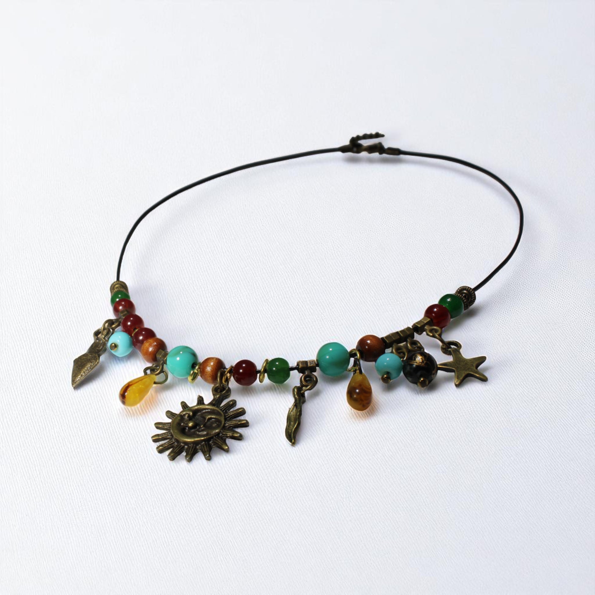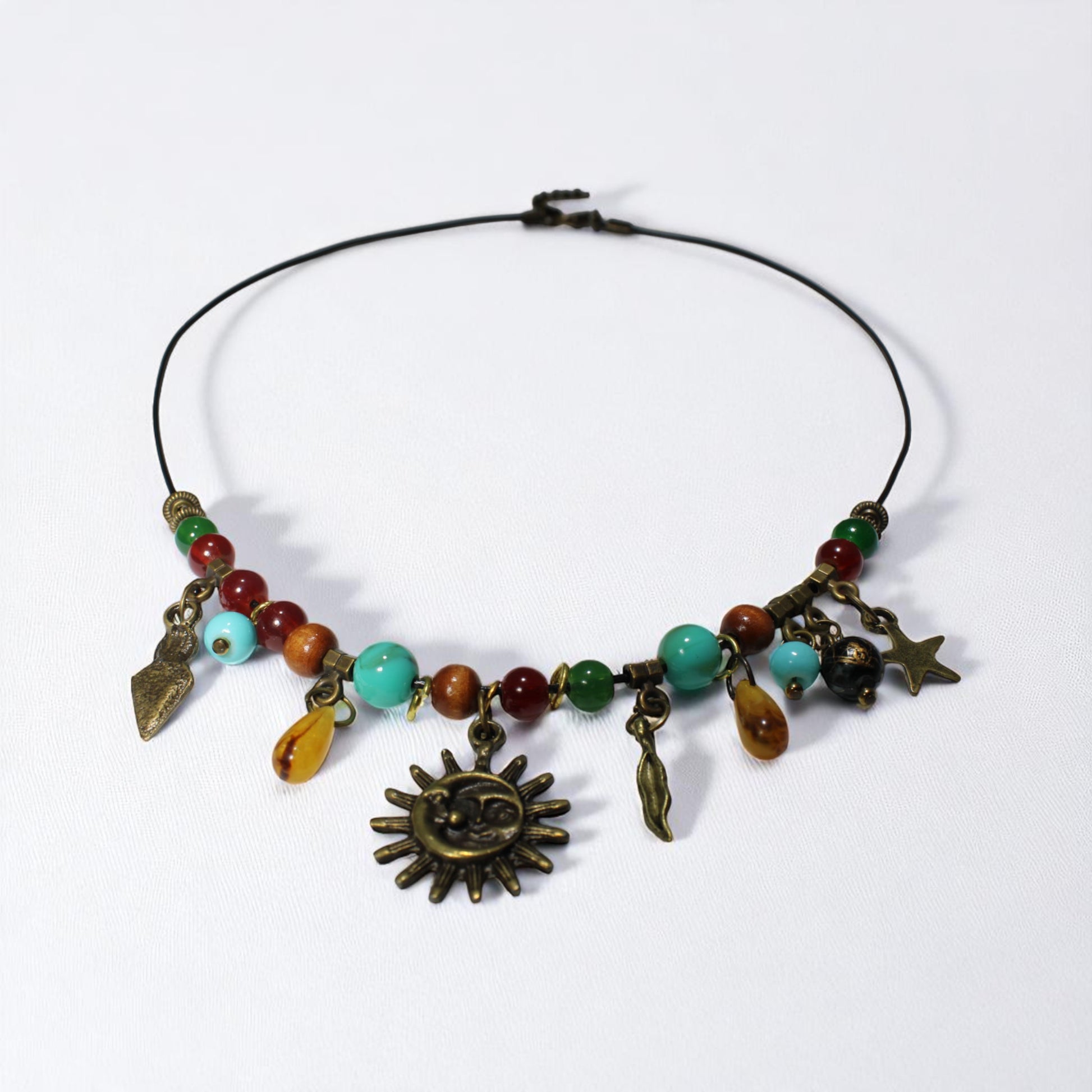 Mistik sembollerden ilham alınarak tasarlanan bu el yapımı kolye, merkezinde yer alan metal güneş ve ay figürleriyle dikkat çeker. Rengarenk cam ve metal boncukların uyumla bir araya getirildiği tasarım, bohem ve özgün bir stil sunar.