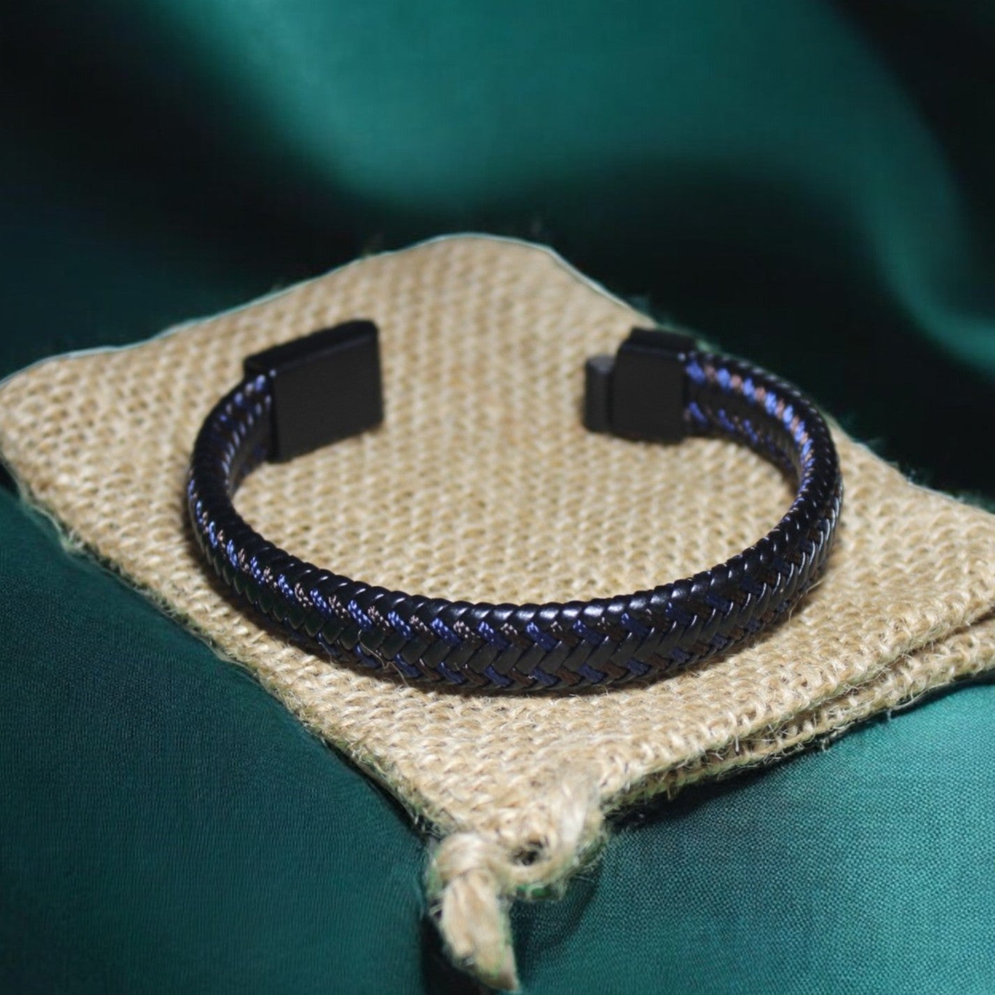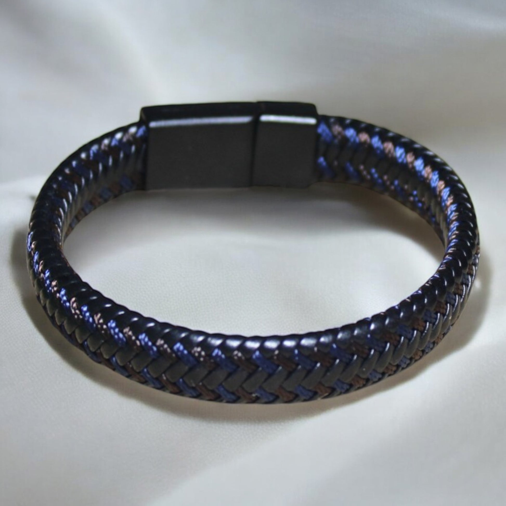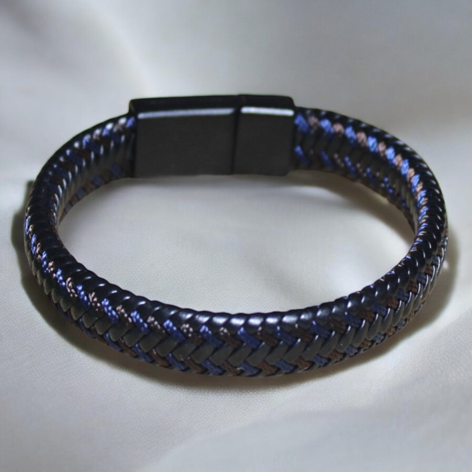 Erkek Deri Bileklik - El Yapımı Hakiki Deri - Siyah Deri içinde Kahverengi Lacivert Örgülü