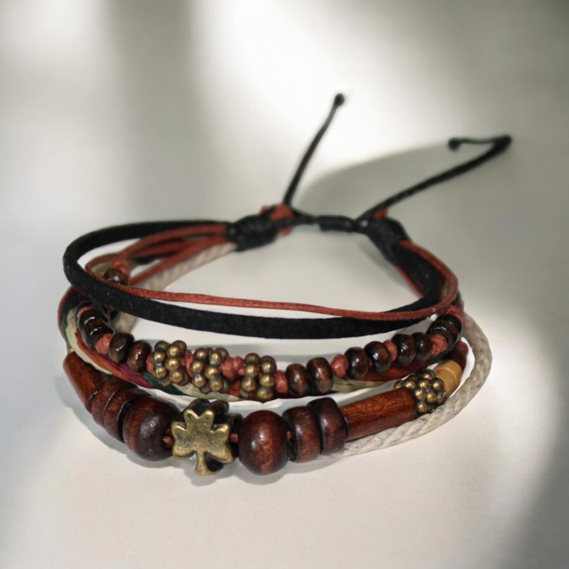 Bu el yapımı bileklik, doğanın döngüsünden ve insanın içsel dönüşümünden ilham alarak tasarlandı. Merkezinde yer alan antik metal yaprak figürü, yeniden doğuşu, değişimi ve doğayla bağı simgeliyor. Farklı ip kombinasyonları, ahşap ve metal boncuklarla birleşerek doğal ve karakterli bir görünüm oluşturuyor.